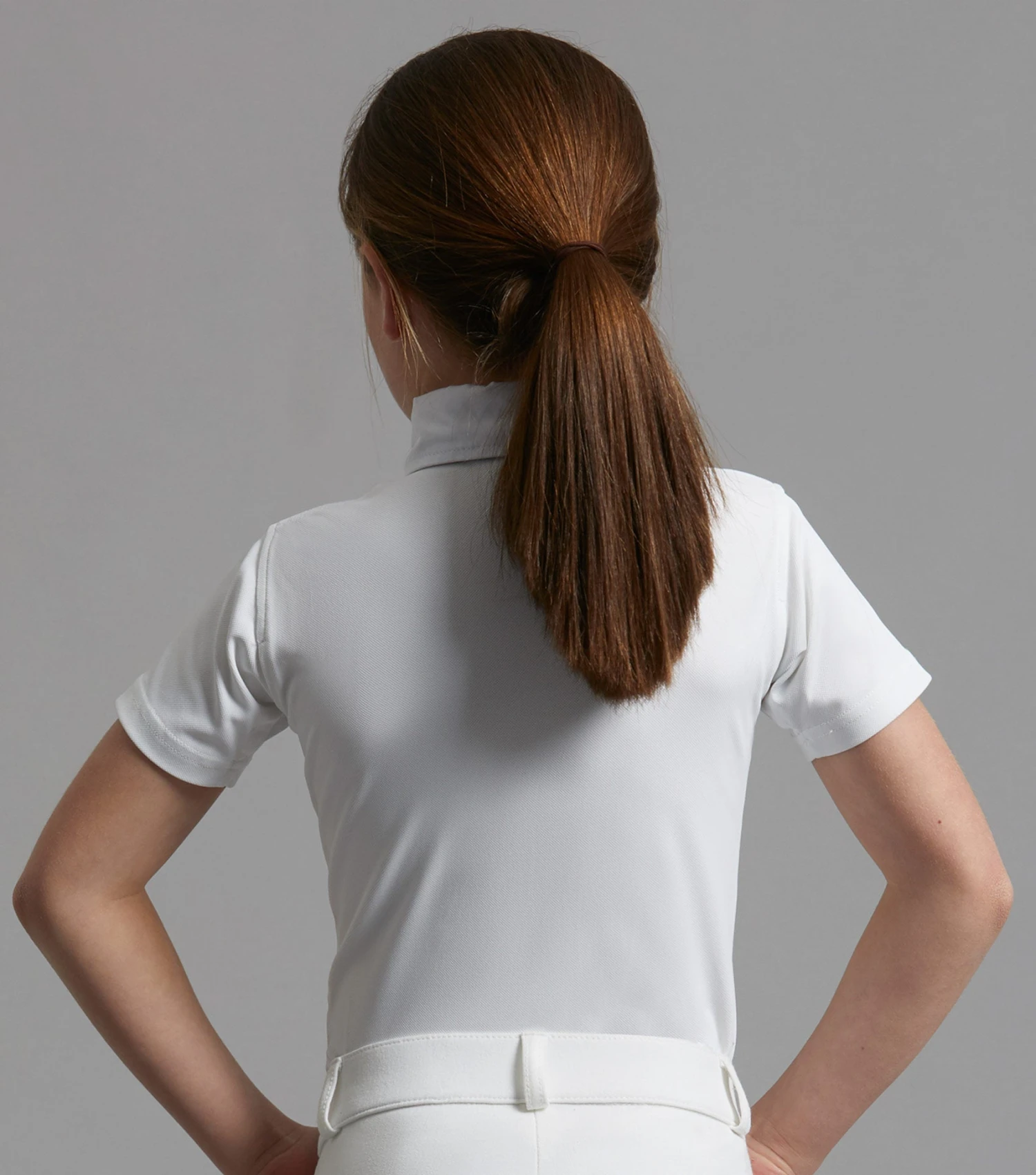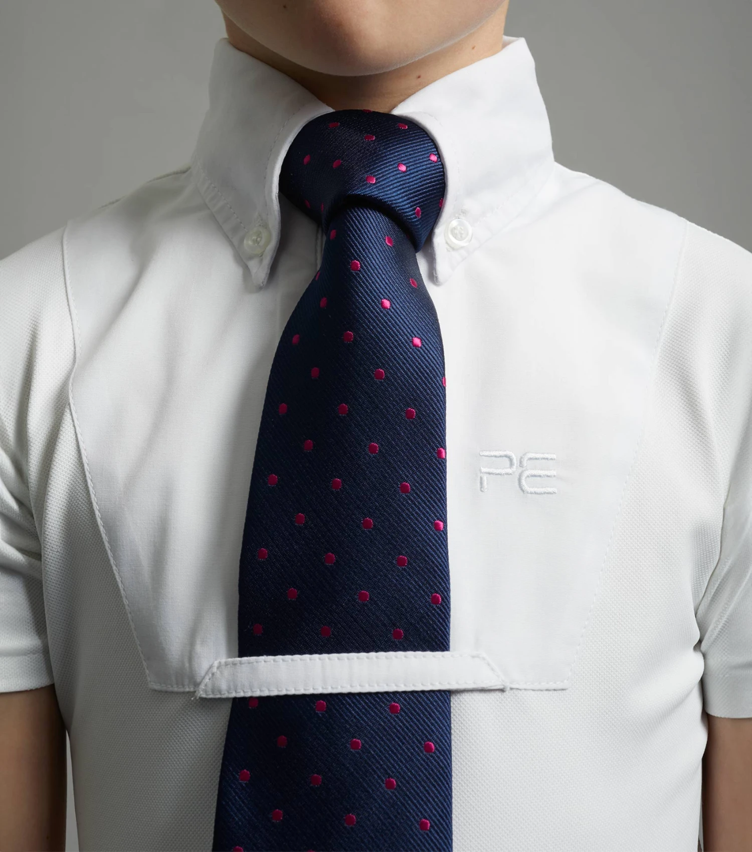 Designed to be worn with a tie and featuring a tie tuck to hold the tie perfectly in place. Holding buttons on the collar corners create a traditional equestrian look, perfect for showing and other riding activities.