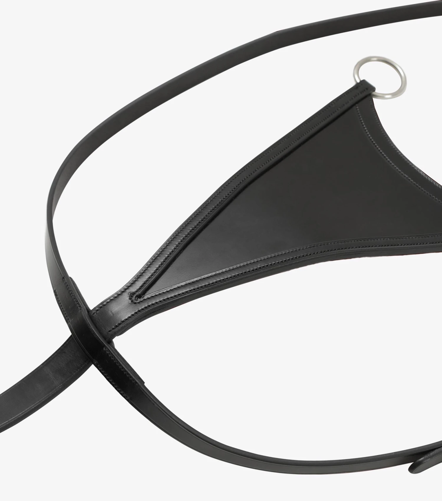 A bib martingale works in the same way as a classic running martingale. The addition of a bib keeps the reins closer together and also prevents the horse from getting the neck straps in its mouth. It can be used to help prevent a horse from raising its head above a point where it can be controlled. When the horse raises its head too high the martingale applies leverage through the reins to the bit, encouraging the horses head downwards.